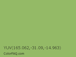YUV 165.062,-31.09,-14.963 Color is a normal green color and the nearest color is Olivine #9ab973. Hex code #94ba66 and RGB value is rgb(148,186,102). In RGB color space, this color is composed of 58% red, 73% green, 40% blue, In CMYK color space, this color is composed of 20% cyan, 0% magenta, 45% yellow , 27% black , In HSL color space, this color has a hue angle of 87° , 38% saturation and 56% lightness.