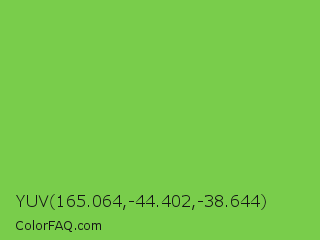YUV 165.064,-44.402,-38.644 Color is a normal green color and the nearest color is Mantis #74c365. Hex code #79cd4b and RGB value is rgb(121,205,75). In RGB color space, this color is composed of 47% red, 80% green, 29% blue, In CMYK color space, this color is composed of 41% cyan, 0% magenta, 63% yellow , 20% black , In HSL color space, this color has a hue angle of 99° , 57% saturation and 55% lightness.