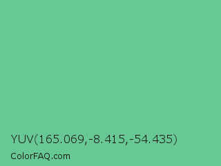 YUV 165.069,-8.415,-54.435 Color is a normal green color and the nearest color is Silver Tree #66b58f. Hex code #67c894 and RGB value is rgb(103,200,148). In RGB color space, this color is composed of 40% red, 78% green, 58% blue, In CMYK color space, this color is composed of 49% cyan, 0% magenta, 26% yellow , 22% black , In HSL color space, this color has a hue angle of 148° , 47% saturation and 59% lightness.