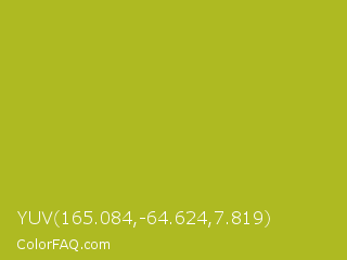 YUV 165.084,-64.624,7.819 Color is a normal yellow color and the nearest color is Acid Green #b0bf1a. Hex code #aeba22 and RGB value is rgb(174,186,34). In RGB color space, this color is composed of 68% red, 73% green, 13% blue, In CMYK color space, this color is composed of 6% cyan, 0% magenta, 82% yellow , 27% black , In HSL color space, this color has a hue angle of 65° , 69% saturation and 43% lightness.