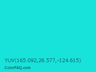 YUV 165.092,26.577,-124.615 Color is a normal cyan color and the nearest color is Bright Turquoise #08e8de. Hex code #17e3db and RGB value is rgb(23,227,219). In RGB color space, this color is composed of 9% red, 89% green, 86% blue, In CMYK color space, this color is composed of 90% cyan, 0% magenta, 4% yellow , 11% black , In HSL color space, this color has a hue angle of 178° , 82% saturation and 49% lightness.