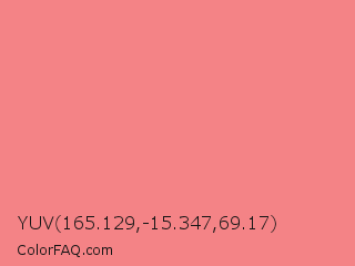 YUV 165.129,-15.347,69.17 Color is a light red color and the nearest color is Light Coral #f08080. Hex code #f48386 and RGB value is rgb(244,131,134). In RGB color space, this color is composed of 96% red, 51% green, 53% blue, In CMYK color space, this color is composed of 0% cyan, 46% magenta, 45% yellow , 4% black , In HSL color space, this color has a hue angle of 358° , 84% saturation and 74% lightness.