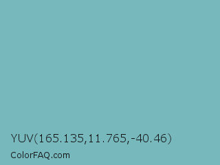 YUV 165.135,11.765,-40.46 Color is a normal cyan color and the nearest color is Neptune #7cb7bb. Hex code #77b8bd and RGB value is rgb(119,184,189). In RGB color space, this color is composed of 47% red, 72% green, 74% blue, In CMYK color space, this color is composed of 37% cyan, 3% magenta, 0% yellow , 26% black , In HSL color space, this color has a hue angle of 184° , 35% saturation and 60% lightness.