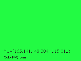 YUV 165.141,-48.384,-115.011 Color is a normal green color and the nearest color is Malachite #0bda51. Hex code #22fb43 and RGB value is rgb(34,251,67). In RGB color space, this color is composed of 13% red, 98% green, 26% blue, In CMYK color space, this color is composed of 86% cyan, 0% magenta, 73% yellow , 2% black , In HSL color space, this color has a hue angle of 129° , 96% saturation and 56% lightness.
