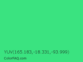YUV 165.183,-18.331,-93.999 Color is a normal green color and the nearest color is UFO Green #3cd070. Hex code #3ae380 and RGB value is rgb(58,227,128). In RGB color space, this color is composed of 23% red, 89% green, 50% blue, In CMYK color space, this color is composed of 74% cyan, 0% magenta, 44% yellow , 11% black , In HSL color space, this color has a hue angle of 145° , 75% saturation and 56% lightness.