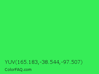 YUV 165.183,-38.544,-97.507 Color is a normal green color and the nearest color is UFO Green #3cd070. Hex code #36ed57 and RGB value is rgb(54,237,87). In RGB color space, this color is composed of 21% red, 93% green, 34% blue, In CMYK color space, this color is composed of 77% cyan, 0% magenta, 63% yellow , 7% black , In HSL color space, this color has a hue angle of 131° , 84% saturation and 57% lightness.