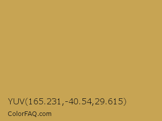 YUV 165.231,-40.54,29.615 Color is a normal orange color and the nearest color is Roti #c6a84b. Hex code #c7a453 and RGB value is rgb(199,164,83). In RGB color space, this color is composed of 78% red, 64% green, 33% blue, In CMYK color space, this color is composed of 0% cyan, 18% magenta, 58% yellow , 22% black , In HSL color space, this color has a hue angle of 42° , 51% saturation and 55% lightness.