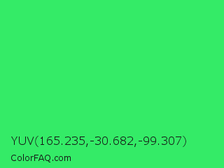 YUV 165.235,-30.682,-99.307 Color is a normal green color and the nearest color is UFO Green #3cd070. Hex code #34eb67 and RGB value is rgb(52,235,103). In RGB color space, this color is composed of 20% red, 92% green, 40% blue, In CMYK color space, this color is composed of 78% cyan, 0% magenta, 56% yellow , 8% black , In HSL color space, this color has a hue angle of 137° , 82% saturation and 56% lightness.