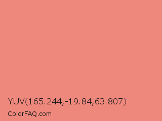YUV 165.244,-19.84,63.807 Color is a light red color and the nearest color is Light Coral #f08080. Hex code #ee887d and RGB value is rgb(238,136,125). In RGB color space, this color is composed of 93% red, 53% green, 49% blue, In CMYK color space, this color is composed of 0% cyan, 43% magenta, 47% yellow , 7% black , In HSL color space, this color has a hue angle of 6° , 77% saturation and 71% lightness.