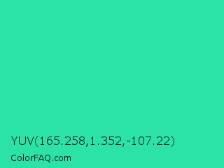 YUV 165.258,1.352,-107.22 Color is a normal green color and the nearest color is Eucalyptus #44d7a8. Hex code #2be3a8 and RGB value is rgb(43,227,168). In RGB color space, this color is composed of 17% red, 89% green, 66% blue, In CMYK color space, this color is composed of 81% cyan, 0% magenta, 26% yellow , 11% black , In HSL color space, this color has a hue angle of 161° , 77% saturation and 53% lightness.