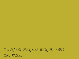 YUV 165.295,-57.826,20.789 Color is a normal yellow color and the nearest color is Hokey Pokey #c8a528. Hex code #bdb030 and RGB value is rgb(189,176,48). In RGB color space, this color is composed of 74% red, 69% green, 19% blue, In CMYK color space, this color is composed of 0% cyan, 7% magenta, 75% yellow , 26% black , In HSL color space, this color has a hue angle of 54° , 59% saturation and 46% lightness.