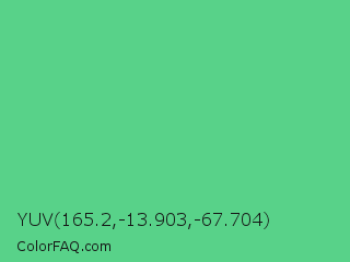 YUV 165.2,-13.903,-67.704 Color is a normal green color and the nearest color is Emerald #50c878. Hex code #58d289 and RGB value is rgb(88,210,137). In RGB color space, this color is composed of 35% red, 82% green, 54% blue, In CMYK color space, this color is composed of 58% cyan, 0% magenta, 35% yellow , 18% black , In HSL color space, this color has a hue angle of 144° , 58% saturation and 58% lightness.