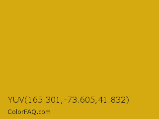 YUV 165.301,-73.605,41.832 Color is a normal yellow color and the nearest color is Galliano #dcb20c. Hex code #d5aa10 and RGB value is rgb(213,170,16). In RGB color space, this color is composed of 84% red, 67% green, 6% blue, In CMYK color space, this color is composed of 0% cyan, 20% magenta, 92% yellow , 16% black , In HSL color space, this color has a hue angle of 47° , 86% saturation and 45% lightness.