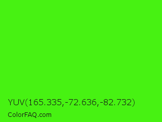 YUV 165.335,-72.636,-82.732 Color is a normal green color and the nearest color is Neon Green #39ff14. Hex code #47f212 and RGB value is rgb(71,242,18). In RGB color space, this color is composed of 28% red, 95% green, 7% blue, In CMYK color space, this color is composed of 71% cyan, 0% magenta, 93% yellow , 5% black , In HSL color space, this color has a hue angle of 106° , 90% saturation and 51% lightness.
