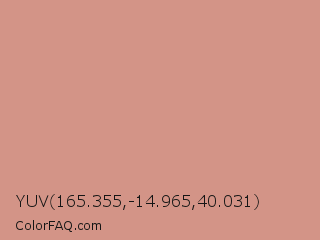 YUV 165.355,-14.965,40.031 Color is a light red color and the nearest color is My Pink #d69188. Hex code #d39487 and RGB value is rgb(211,148,135). In RGB color space, this color is composed of 83% red, 58% green, 53% blue, In CMYK color space, this color is composed of 0% cyan, 30% magenta, 36% yellow , 17% black , In HSL color space, this color has a hue angle of 10° , 46% saturation and 68% lightness.