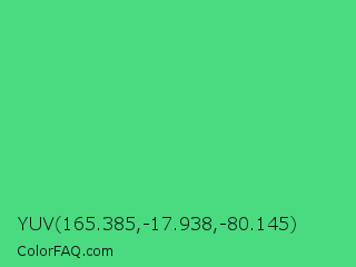 YUV 165.385,-17.938,-80.145 Color is a normal green color and the nearest color is Emerald #50c878. Hex code #4adb81 and RGB value is rgb(74,219,129). In RGB color space, this color is composed of 29% red, 86% green, 51% blue, In CMYK color space, this color is composed of 66% cyan, 0% magenta, 41% yellow , 14% black , In HSL color space, this color has a hue angle of 143° , 67% saturation and 57% lightness.