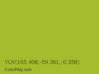 YUV 165.408,-59.361,-0.358 Color is a normal yellow color and the nearest color is Android Green #a4c639. Hex code #a5bd2d and RGB value is rgb(165,189,45). In RGB color space, this color is composed of 65% red, 74% green, 18% blue, In CMYK color space, this color is composed of 13% cyan, 0% magenta, 76% yellow , 26% black , In HSL color space, this color has a hue angle of 70° , 62% saturation and 46% lightness.