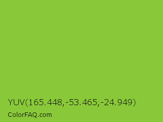 YUV 165.448,-53.465,-24.949 Color is a normal green color and the nearest color is Yellow Green #9acd32. Hex code #89c939 and RGB value is rgb(137,201,57). In RGB color space, this color is composed of 54% red, 79% green, 22% blue, In CMYK color space, this color is composed of 32% cyan, 0% magenta, 72% yellow , 21% black , In HSL color space, this color has a hue angle of 87° , 57% saturation and 51% lightness.