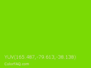 YUV 165.487,-79.613,-38.138 Color is a normal green color and the nearest color is Alien Armpit #84de02. Hex code #7adb04 and RGB value is rgb(122,219,4). In RGB color space, this color is composed of 48% red, 86% green, 2% blue, In CMYK color space, this color is composed of 44% cyan, 0% magenta, 98% yellow , 14% black , In HSL color space, this color has a hue angle of 87° , 96% saturation and 44% lightness.