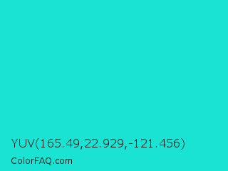YUV 165.49,22.929,-121.456 Color is a normal cyan color and the nearest color is Bright Turquoise #08e8de. Hex code #1be3d4 and RGB value is rgb(27,227,212). In RGB color space, this color is composed of 11% red, 89% green, 83% blue, In CMYK color space, this color is composed of 88% cyan, 0% magenta, 7% yellow , 11% black , In HSL color space, this color has a hue angle of 176° , 79% saturation and 50% lightness.
