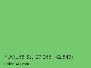YUV 165.51,-27.366,-42.543 Color is a light green color and the nearest color is Mantis #74c365. Hex code #75c96e and RGB value is rgb(117,201,110). In RGB color space, this color is composed of 46% red, 79% green, 43% blue, In CMYK color space, this color is composed of 42% cyan, 0% magenta, 45% yellow , 21% black , In HSL color space, this color has a hue angle of 115° , 46% saturation and 61% lightness.