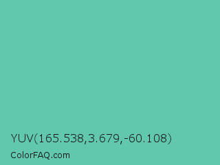 YUV 165.538,3.679,-60.108 Color is a normal cyan color and the nearest color is Tradewind #5fb3ac. Hex code #61c7ad and RGB value is rgb(97,199,173). In RGB color space, this color is composed of 38% red, 78% green, 68% blue, In CMYK color space, this color is composed of 51% cyan, 0% magenta, 13% yellow , 22% black , In HSL color space, this color has a hue angle of 165° , 48% saturation and 58% lightness.