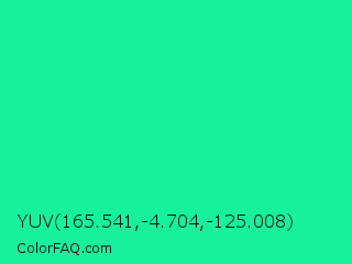 YUV 165.541,-4.704,-125.008 Color is a normal green color and the nearest color is Medium Spring Green #00fa9a. Hex code #17f09c and RGB value is rgb(23,240,156). In RGB color space, this color is composed of 9% red, 94% green, 61% blue, In CMYK color space, this color is composed of 90% cyan, 0% magenta, 35% yellow , 6% black , In HSL color space, this color has a hue angle of 157° , 88% saturation and 52% lightness.