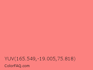YUV 165.549,-19.005,75.818 Color is a light red color and the nearest color is Tea Rose #f88379. Hex code #fc817f and RGB value is rgb(252,129,127). In RGB color space, this color is composed of 99% red, 51% green, 50% blue, In CMYK color space, this color is composed of 0% cyan, 49% magenta, 50% yellow , 1% black , In HSL color space, this color has a hue angle of 1° , 95% saturation and 74% lightness.