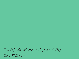 YUV 165.54,-2.731,-57.479 Color is a normal green color and the nearest color is Medium Aquamarine #66ddaa. Hex code #64c8a0 and RGB value is rgb(100,200,160). In RGB color space, this color is composed of 39% red, 78% green, 63% blue, In CMYK color space, this color is composed of 50% cyan, 0% magenta, 20% yellow , 22% black , In HSL color space, this color has a hue angle of 156° , 48% saturation and 59% lightness.
