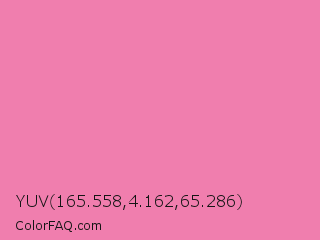 YUV 165.558,4.162,65.286 Color is a light rose color and the nearest color is Carissma #ea88a8. Hex code #f07eae and RGB value is rgb(240,126,174). In RGB color space, this color is composed of 94% red, 49% green, 68% blue, In CMYK color space, this color is composed of 0% cyan, 48% magenta, 28% yellow , 6% black , In HSL color space, this color has a hue angle of 335° , 79% saturation and 72% lightness.