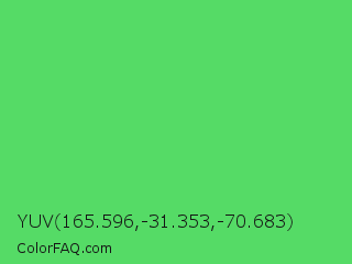 YUV 165.596,-31.353,-70.683 Color is a normal green color and the nearest color is Emerald #50c878. Hex code #55db66 and RGB value is rgb(85,219,102). In RGB color space, this color is composed of 33% red, 86% green, 40% blue, In CMYK color space, this color is composed of 61% cyan, 0% magenta, 53% yellow , 14% black , In HSL color space, this color has a hue angle of 128° , 65% saturation and 60% lightness.
