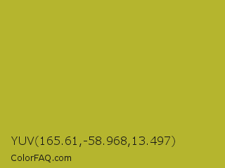 YUV 165.61,-58.968,13.497 Color is a normal yellow color and the nearest color is Acid Green #b0bf1a. Hex code #b5b52e and RGB value is rgb(181,181,46). In RGB color space, this color is composed of 71% red, 71% green, 18% blue, In CMYK color space, this color is composed of 0% cyan, 0% magenta, 75% yellow , 29% black , In HSL color space, this color has a hue angle of 60° , 59% saturation and 45% lightness.