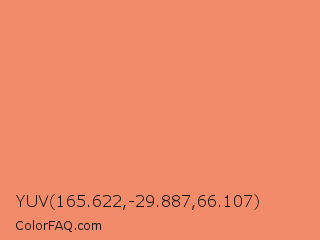 YUV 165.622,-29.887,66.107 Color is a light color and the nearest color is Salmon #ff8c69. Hex code #f18b69 and RGB value is rgb(241,139,105). In RGB color space, this color is composed of 95% red, 55% green, 41% blue, In CMYK color space, this color is composed of 0% cyan, 42% magenta, 56% yellow , 5% black , In HSL color space, this color has a hue angle of 15° , 83% saturation and 68% lightness.