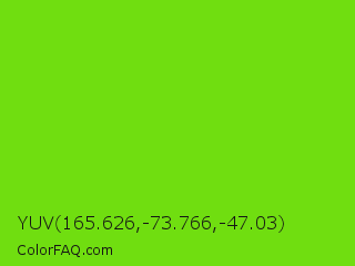 YUV 165.626,-73.766,-47.03 Color is a normal green color and the nearest color is Alien Armpit #84de02. Hex code #70de10 and RGB value is rgb(112,222,16). In RGB color space, this color is composed of 44% red, 87% green, 6% blue, In CMYK color space, this color is composed of 50% cyan, 0% magenta, 93% yellow , 13% black , In HSL color space, this color has a hue angle of 92° , 87% saturation and 47% lightness.