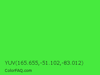 YUV 165.655,-51.102,-83.012 Color is a normal green color and the nearest color is Lime Green #32cd32. Hex code #47ea3e and RGB value is rgb(71,234,62). In RGB color space, this color is composed of 28% red, 92% green, 24% blue, In CMYK color space, this color is composed of 70% cyan, 0% magenta, 74% yellow , 8% black , In HSL color space, this color has a hue angle of 117° , 80% saturation and 58% lightness.