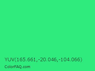 YUV 165.661,-20.046,-104.066 Color is a normal green color and the nearest color is UFO Green #3cd070. Hex code #2fea7d and RGB value is rgb(47,234,125). In RGB color space, this color is composed of 18% red, 92% green, 49% blue, In CMYK color space, this color is composed of 80% cyan, 0% magenta, 47% yellow , 8% black , In HSL color space, this color has a hue angle of 145° , 82% saturation and 55% lightness.