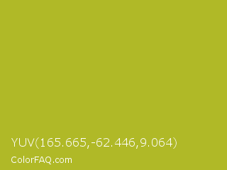 YUV 165.665,-62.446,9.064 Color is a normal yellow color and the nearest color is Acid Green #b0bf1a. Hex code #b0b927 and RGB value is rgb(176,185,39). In RGB color space, this color is composed of 69% red, 73% green, 15% blue, In CMYK color space, this color is composed of 5% cyan, 0% magenta, 79% yellow , 27% black , In HSL color space, this color has a hue angle of 64° , 65% saturation and 44% lightness.