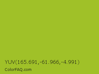 YUV 165.691,-61.966,-4.991 Color is a normal lime color and the nearest color is Atlantis #97cd2d. Hex code #a0c128 and RGB value is rgb(160,193,40). In RGB color space, this color is composed of 63% red, 76% green, 16% blue, In CMYK color space, this color is composed of 17% cyan, 0% magenta, 79% yellow , 24% black , In HSL color space, this color has a hue angle of 73° , 66% saturation and 46% lightness.