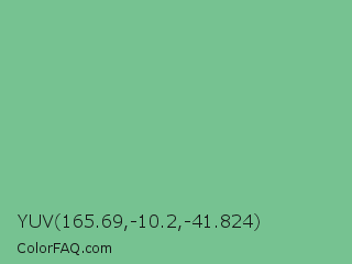 YUV 165.69,-10.2,-41.824 Color is a light green color and the nearest color is De York #7ac488. Hex code #76c291 and RGB value is rgb(118,194,145). In RGB color space, this color is composed of 46% red, 76% green, 57% blue, In CMYK color space, this color is composed of 39% cyan, 0% magenta, 25% yellow , 24% black , In HSL color space, this color has a hue angle of 141° , 38% saturation and 61% lightness.