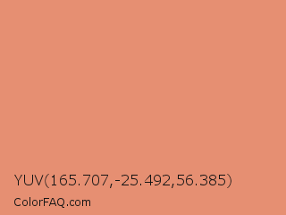 YUV 165.707,-25.492,56.385 Color is a light color and the nearest color is Middle Red #e58e73. Hex code #e68f72 and RGB value is rgb(230,143,114). In RGB color space, this color is composed of 90% red, 56% green, 45% blue, In CMYK color space, this color is composed of 0% cyan, 38% magenta, 50% yellow , 10% black , In HSL color space, this color has a hue angle of 15° , 70% saturation and 67% lightness.