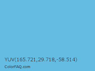 YUV 165.721,29.718,-58.514 Color is a light blue color and the nearest color is Viking #64ccdb. Hex code #63bce2 and RGB value is rgb(99,188,226). In RGB color space, this color is composed of 39% red, 74% green, 89% blue, In CMYK color space, this color is composed of 56% cyan, 17% magenta, 0% yellow , 11% black , In HSL color space, this color has a hue angle of 198° , 69% saturation and 64% lightness.