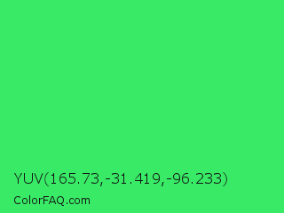 YUV 165.73,-31.419,-96.233 Color is a normal green color and the nearest color is UFO Green #3cd070. Hex code #38ea66 and RGB value is rgb(56,234,102). In RGB color space, this color is composed of 22% red, 92% green, 40% blue, In CMYK color space, this color is composed of 76% cyan, 0% magenta, 56% yellow , 8% black , In HSL color space, this color has a hue angle of 136° , 81% saturation and 57% lightness.