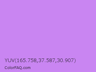 YUV 165.758,37.587,30.907 Color is a light purple color and the nearest color is Bright Lilac #d891ef. Hex code #c985f2 and RGB value is rgb(201,133,242). In RGB color space, this color is composed of 79% red, 52% green, 95% blue, In CMYK color space, this color is composed of 17% cyan, 45% magenta, 0% yellow , 5% black , In HSL color space, this color has a hue angle of 277° , 81% saturation and 74% lightness.