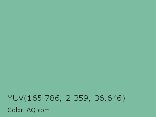 YUV 165.786,-2.359,-36.646 Color is a light green color and the nearest color is Acapulco #7cb0a1. Hex code #7cbca1 and RGB value is rgb(124,188,161). In RGB color space, this color is composed of 49% red, 74% green, 63% blue, In CMYK color space, this color is composed of 34% cyan, 0% magenta, 14% yellow , 26% black , In HSL color space, this color has a hue angle of 155° , 32% saturation and 61% lightness.