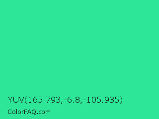 YUV 165.793,-6.8,-105.935 Color is a normal green color and the nearest color is Shamrock #33cc99. Hex code #2de698 and RGB value is rgb(45,230,152). In RGB color space, this color is composed of 18% red, 90% green, 60% blue, In CMYK color space, this color is composed of 80% cyan, 0% magenta, 34% yellow , 10% black , In HSL color space, this color has a hue angle of 155° , 79% saturation and 54% lightness.