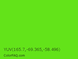YUV 165.7,-69.365,-58.496 Color is a normal green color and the nearest color is Bright Green #66ff00. Hex code #63e319 and RGB value is rgb(99,227,25). In RGB color space, this color is composed of 39% red, 89% green, 10% blue, In CMYK color space, this color is composed of 56% cyan, 0% magenta, 89% yellow , 11% black , In HSL color space, this color has a hue angle of 98° , 80% saturation and 49% lightness.