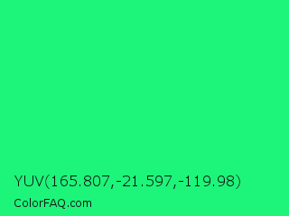 YUV 165.807,-21.597,-119.98 Color is a normal green color and the nearest color is Spring Green #00ff7f. Hex code #1df47a and RGB value is rgb(29,244,122). In RGB color space, this color is composed of 11% red, 96% green, 48% blue, In CMYK color space, this color is composed of 88% cyan, 0% magenta, 50% yellow , 4% black , In HSL color space, this color has a hue angle of 146° , 91% saturation and 54% lightness.