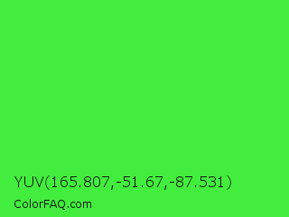 YUV 165.807,-51.67,-87.531 Color is a normal green color and the nearest color is Lime Green #32cd32. Hex code #42ed3d and RGB value is rgb(66,237,61). In RGB color space, this color is composed of 26% red, 93% green, 24% blue, In CMYK color space, this color is composed of 72% cyan, 0% magenta, 74% yellow , 7% black , In HSL color space, this color has a hue angle of 118° , 83% saturation and 58% lightness.