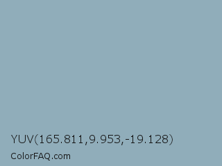 YUV 165.811,9.953,-19.128 Color is a light blue color and the nearest color is Nepal #8eabc1. Hex code #90adba and RGB value is rgb(144,173,186). In RGB color space, this color is composed of 56% red, 68% green, 73% blue, In CMYK color space, this color is composed of 23% cyan, 7% magenta, 0% yellow , 27% black , In HSL color space, this color has a hue angle of 199° , 23% saturation and 65% lightness.