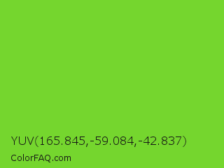 YUV 165.845,-59.084,-42.837 Color is a normal green color and the nearest color is Kiwi #8ee53f. Hex code #75d62e and RGB value is rgb(117,214,46). In RGB color space, this color is composed of 46% red, 84% green, 18% blue, In CMYK color space, this color is composed of 45% cyan, 0% magenta, 79% yellow , 16% black , In HSL color space, this color has a hue angle of 95° , 67% saturation and 51% lightness.